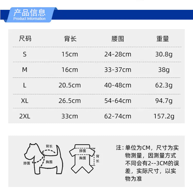 Ces pantalons sont fabriqués en polyester de haute qualité et disponibles en trois couleurs élégantes : bleu, gris et marron. Que vous ayez un petit chiot ou une grande race, nous offrons une variété de tailles allant de S à 2XL pour s'adapter parfaitement aux chiens de toutes formes et tailles.
